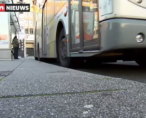 Chauffeur van De Lijn vertrekt met peuter in buggy in bus, terwijl moeder nog buiten aan de halte staat.